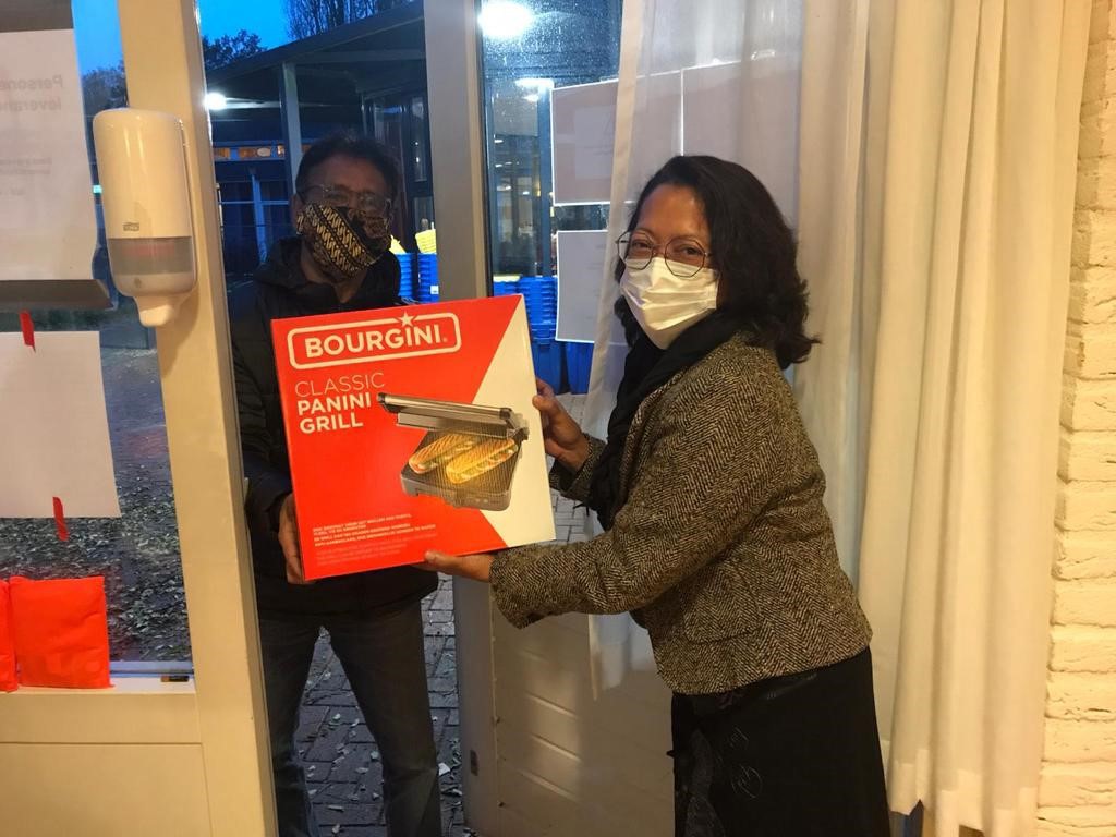 Bijschrift foto: burgemeester Tjeerd van der Zwan overhandigt een tostiapparaat aan Eileen van Ligten (hoofd Coronacentrum Friesland).
