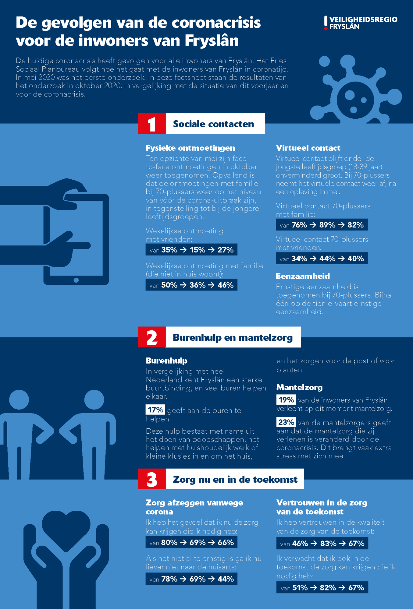 De sociale samenhang in Fryslân is nog altijd sterk en de bereidheid om elkaar te helpen is toegenomen. Bijna één op de vijf (17%) geeft al burenhulp, zoals boodschappen halen of helpen met een huishoudelijk klusje. Het beeld van een toegenomen buurtbinding en meer burenhulp in coronatijd gaat echter niet overal in gelijke mate op. Dit is met name het geval in buurten die al een sterke buurtbinding hadden. Naarmate de crisis en strenge maatregelen langer aanhouden kan de sociale samenhang onder druk komen te staan. Uit het onderzoek blijkt dat inwoners die meer problemen en zorgen ervaren, vervolgens ook minder vertrouwen hebben in de overheid en in elkaar. Vooral in buurten waar bewoners weinig binding met de buurt ervaren komen spanningen tussen bewoners nu vaker aan de oppervlakte. In buurten met goede buurtrelaties daarentegen ervaart men vaker dat bewoners juist beter met elkaar omgaan en er meer buurtinitiatieven zijn sinds de coronacrisis .