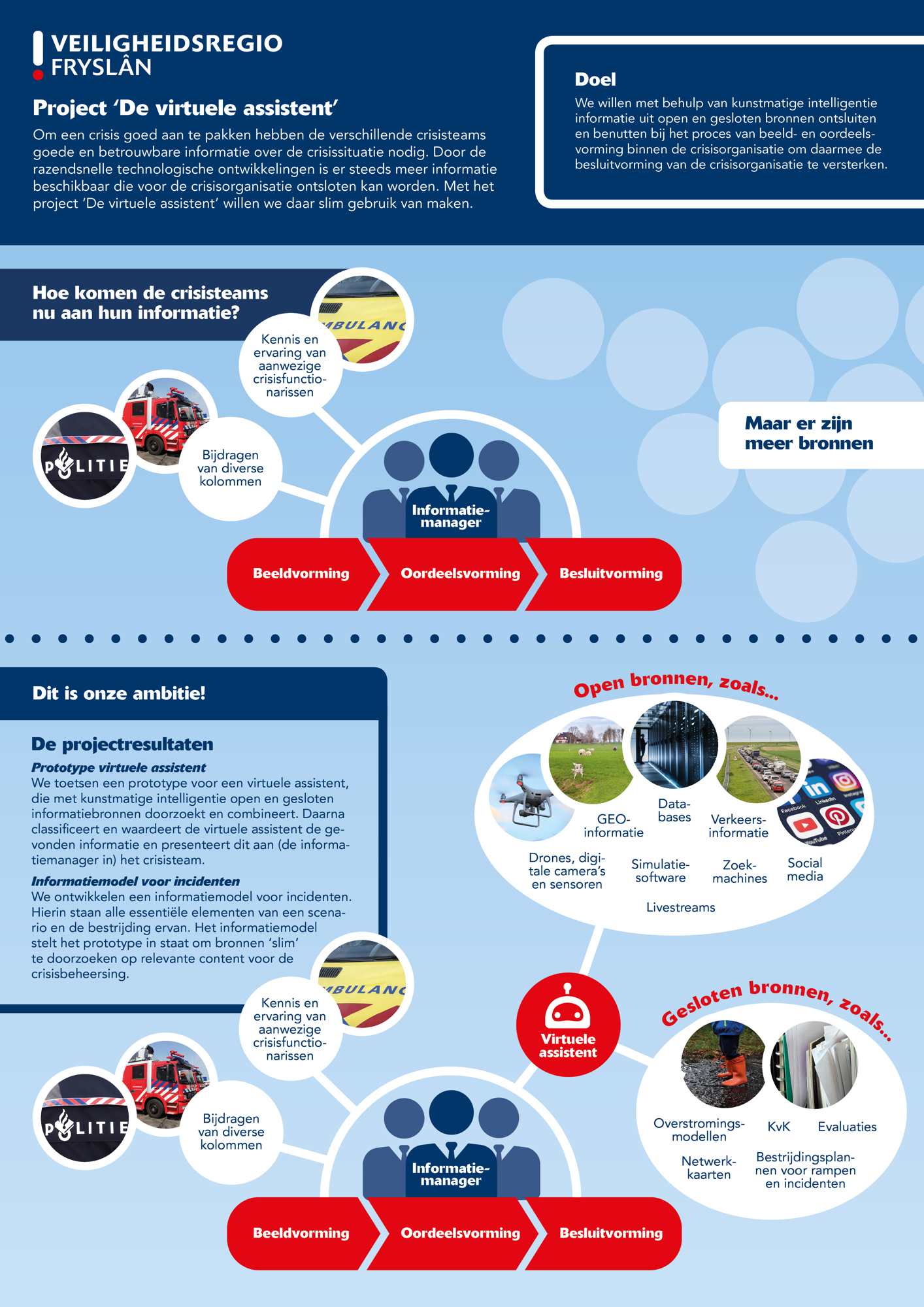 Het doel van het innovatieve project ‘De virtuele assistent’ was om te onderzoeken hoe alle voor een crisis relevante informatie slim kan worden gebruikt. Dan kun je denken aan bijvoorbeeld livestreams, GEO-informatie, evaluaties, actuele verkeersinformatie of simulatiesoftware. Die informatie wordt nu niet altijd benut, onder andere omdat vaak de tijd ontbreekt om al deze bronnen te doorzoeken. Om deze gegevens wél te kunnen benutten heeft Veiligheidsregio Fryslân nauw samengewerkt met Pandora Intelligence, die het prototype voor de virtuele assistent heeft ontwikkeld. Voor de uitvoering van het project heeft Veiligheidsregio Fryslân een financiële stimulans ontvangen van het Ministerie van Justitie en Veiligheid.