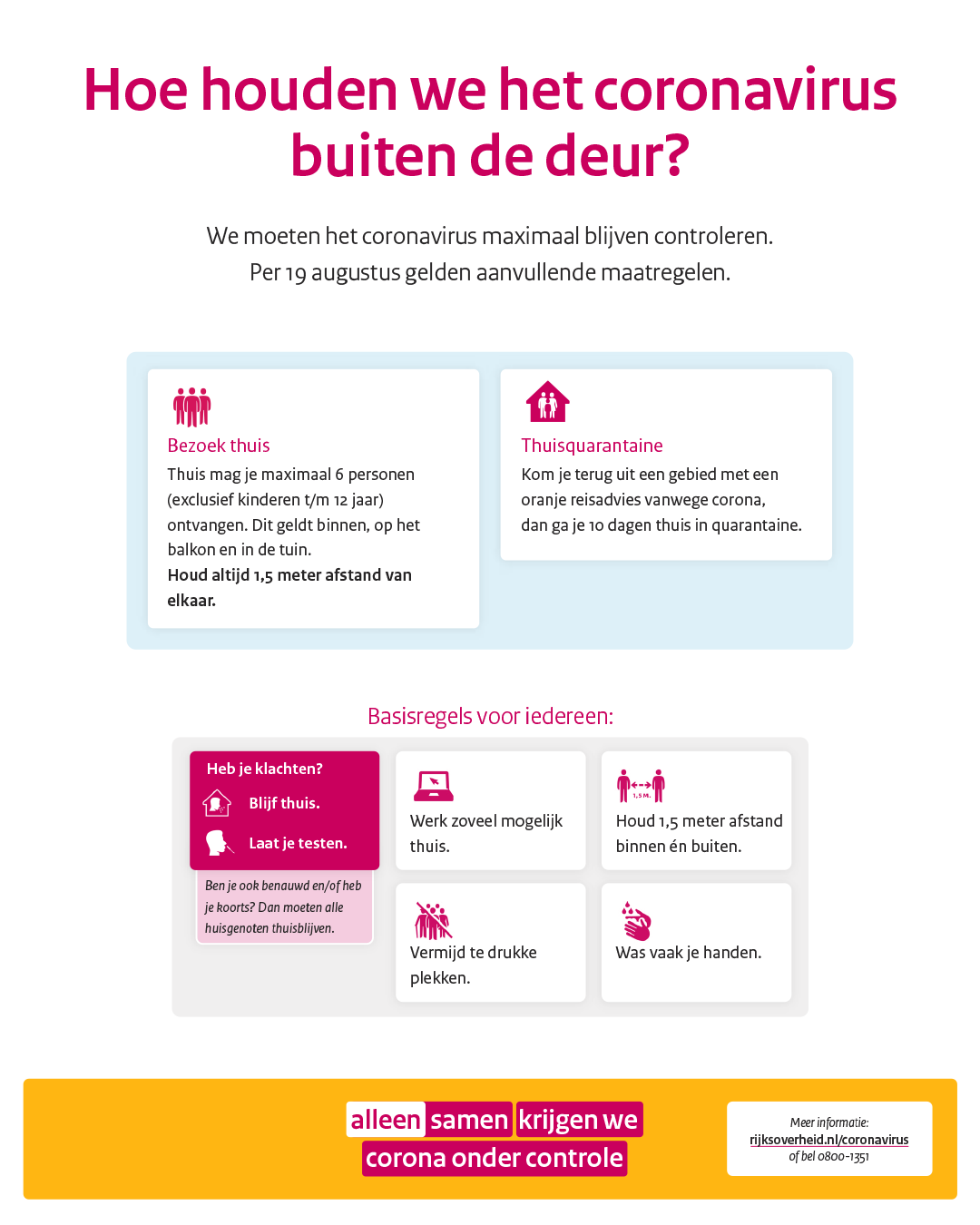 Verder blijft ook onverkort gelden dat iedereen thuis blijft bij klachten en zich laat testen. Daarmee kan het allergrootste deel van de besmettingen worden voorkomen. Bij een positieve testuitslag volgt dan bron- en contactonderzoek. Daarmee verbetert het zicht op de verspreiding van het virus. En kan snel en gericht worden bijgestuurd om de verspreiding tegen te gaan, daar waar het virus oplaait.