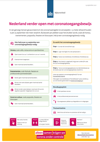 Vanaf 25 september is er in alle horeca (behalve afhaalrestaurants), bij evenementen (zoals festivals, optredens, feesten en publiek bij professionele sportwedstrijden) en bij vertoning van kunst en cultuur (zoals in bioscopen en theaters) gewerkt alleen toegang mogelijk met het coronatoegangsbewijs voor iedereen vanaf 13 jaar. Dat geldt binnen én buiten, met én zonder vaste zitplaats. Vanaf 14 jaar moet het gebruik van het coronatoegangsbewijs samen met het identiteitsbewijs worden gecontroleerd. In alle horeca blijft de verplichte sluitingstijd tussen 00.00 en 06.00 uur gelden. Alle evenementen kunnen weer plaatsvinden met een coronatoegangsbewijs. Voor evenementen buiten geldt geen maximaal aantal bezoekers en geen verplichte sluitingstijd. Voor evenementen binnen met een vaste zitplaats is er ook geen maximaal aantal bezoekers of sluitingstijd. Voor beide type evenementen geldt wel: horeca is na 0.00 uur gesloten, met uitzondering van afhaalmogelijkheden. Evenementen binnen zonder vaste zitplaats kunnen maximaal 75% van de reguliere bezoekerscapaciteit toestaan en er geldt hier een verplichte sluitingstijd tussen 00.00 en 06.00 uur. Het kabinet werkt voor de nachthoreca en de ongeplaceerde evenementen met een capaciteitsbeperking aan steunmaatregelen. De uitwerking wordt zo snel mogelijk bekend gemaakt.