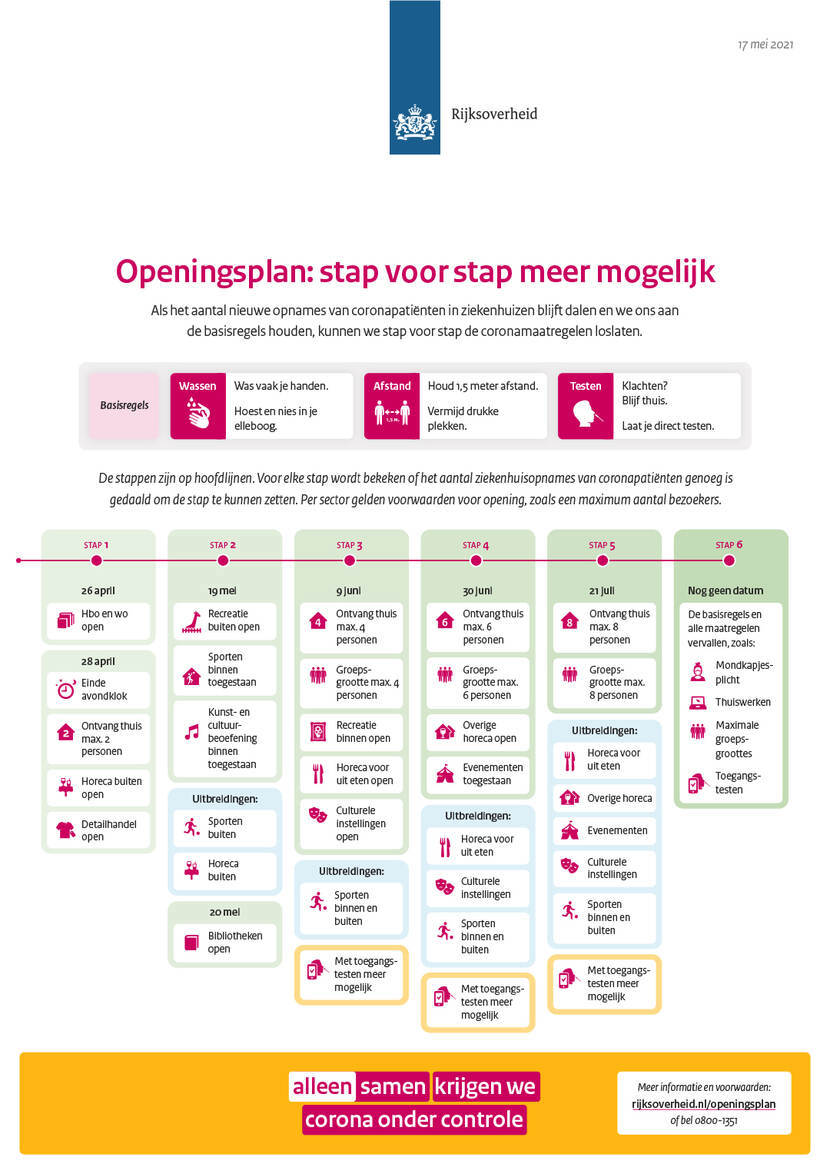 Het kabinet heeft daarom een openingsplan gemaakt. Het veilig openen van de samenleving gaat stap voor stap. Dit kan alleen als er minder mensen met corona in het ziekenhuis worden opgenomen. Het is ook belangrijk dat iedereen zich aan de basisregels houdt. Handen wassen, afstand houden en thuisblijven en testen bij klachten voorkomt besmettingen. Zo kan er sneller meer.
