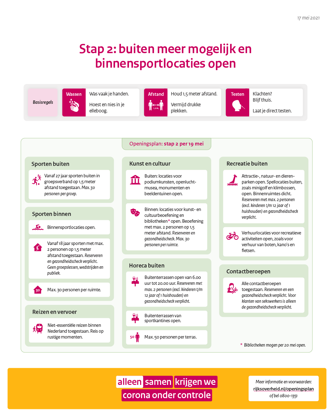 Vandaag werd ook een nieuwe planning van het openingsplan vastgesteld. Hierin staat welke vervolgstappen het kabinet wanneer wil zetten, als de cijfers dit toelaten. De derde stap zal op z’n vroegst 9 juni gezet worden. Op 1 juni horen we of dit daadwerkelijk kan.
